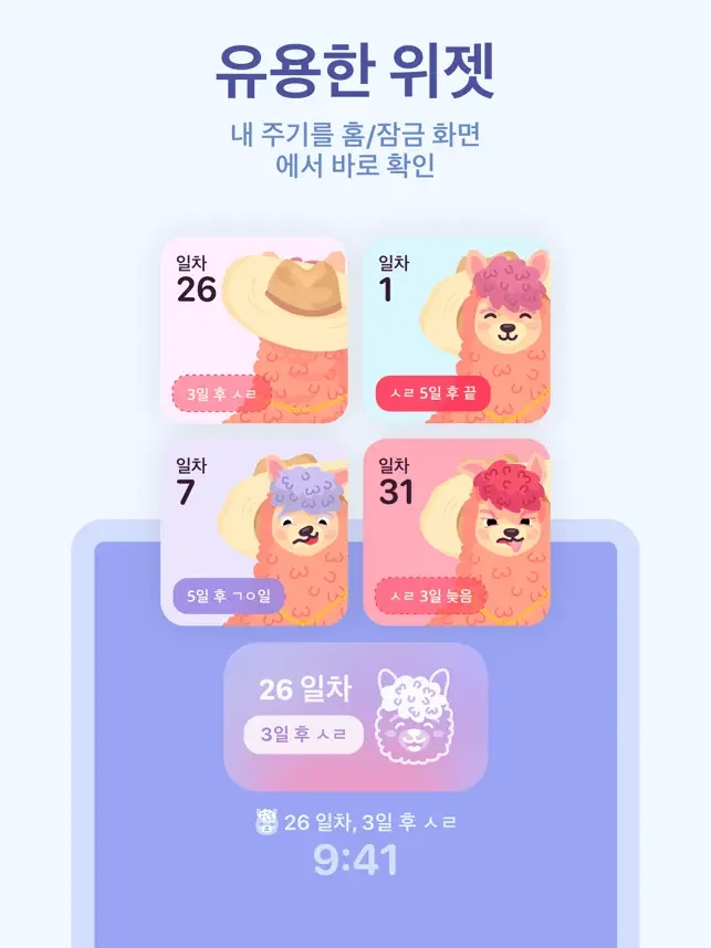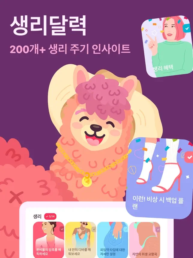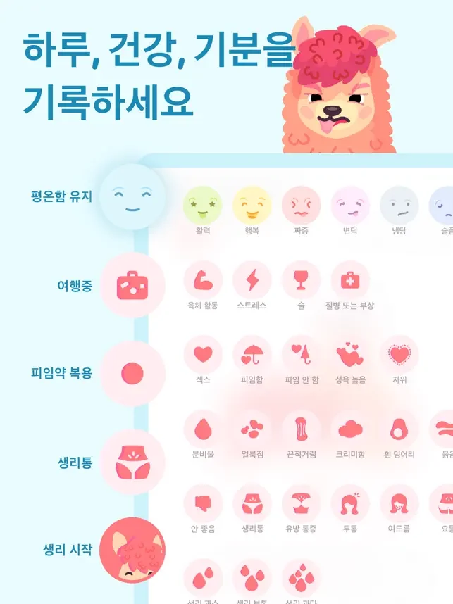 Pinkllama는 사용자의 기분에 맞춰주는 귀여운 동반인으로 매일 증상을 기록할 것을 권장합니다.