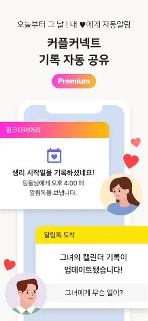 핑크다이어리에서 내 생리를 기록하고, 분석하고, 이를 사랑하는 사람에게 커플커넥트로 공유하세요!