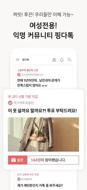 내 또래 여자친구들도 나랑 똑같은 고민 중이라고? 이런 재미있는 일상을 보내고 있다고? 오로지 여성들만 들어올 수 있는 핑다톡 커뮤니티에서 익명으로 일상과 고민을 나눠 봐요. 학업, 커리어, 가족, 우정, 연애, 건강, 반려동물 등 내가 말하는 무엇이든 핑다가 철저한 비밀을 보장할게요.