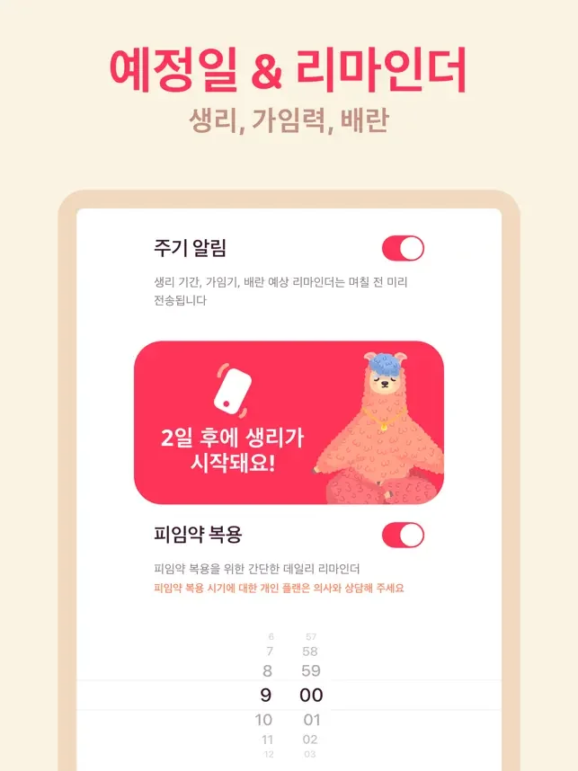 모든 예상이 100%% 정확하지 않을 수도 있다는 점에 유의해 주세요. 우리 신체는 주기마다 다르게 작동할 수 있습니다. Pinkllama는 건강을 추절할 수 있게 도와줍니다. 하지만 평소와 다르거나 우려되는 증상이 있다면 항상 의사와 상담해야 합니다.