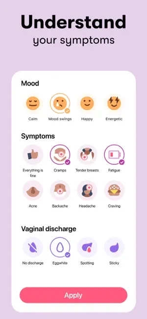 • 일일 기록을 사용하여 생리량 및 생리통, 두통, 복부 팽만과 같은 증상을 기록할 수 있습니다.