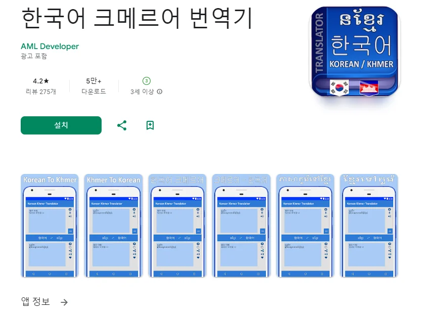 이 어플은 구글플레이스토어에서 "캄보디아어 번역"로 검색했을때 2번째로 나오는 어플입니다. 아래는 크메르어 한국어 번역기 어플에 대한 자세한 설명이니 참고하세요.