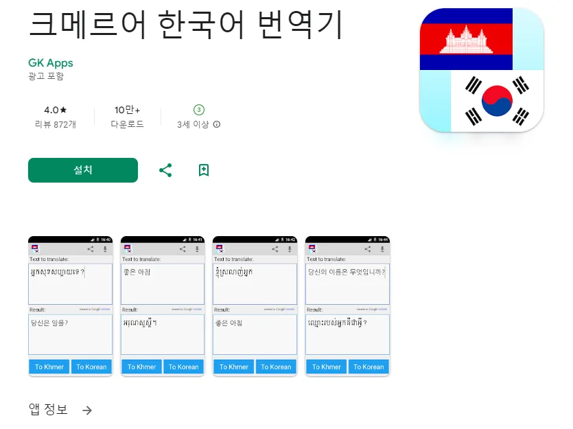 아래는 크메르어 한국어 번역기 어플에 대한 스크린샷 정보입니다.