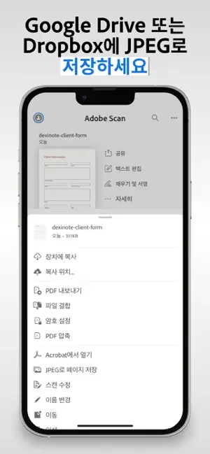 • 중요 문서를 빠르게 스캔하고 Dropbox 또는 Google Drive에 저장하여 어디서나 액세스하고 공유합니다.