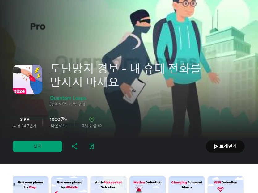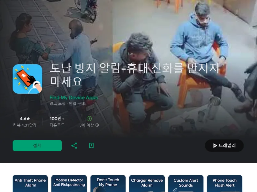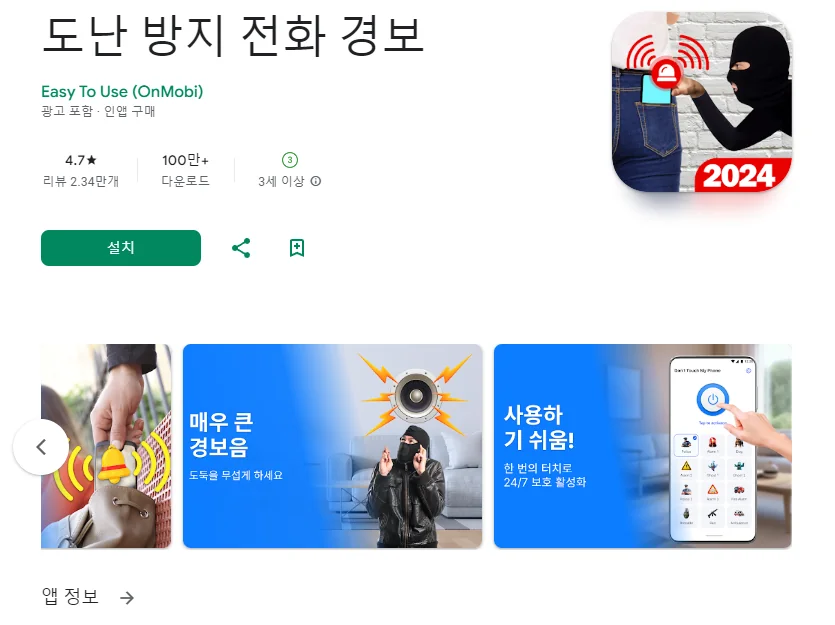 이 어플은 구글플레이스토어에서 "도난방지"로 검색했을때 2번째로 나오는 어플입니다. 아래는 도난 방지 전화 경보 어플에 대한 자세한 설명이니 참고하세요.