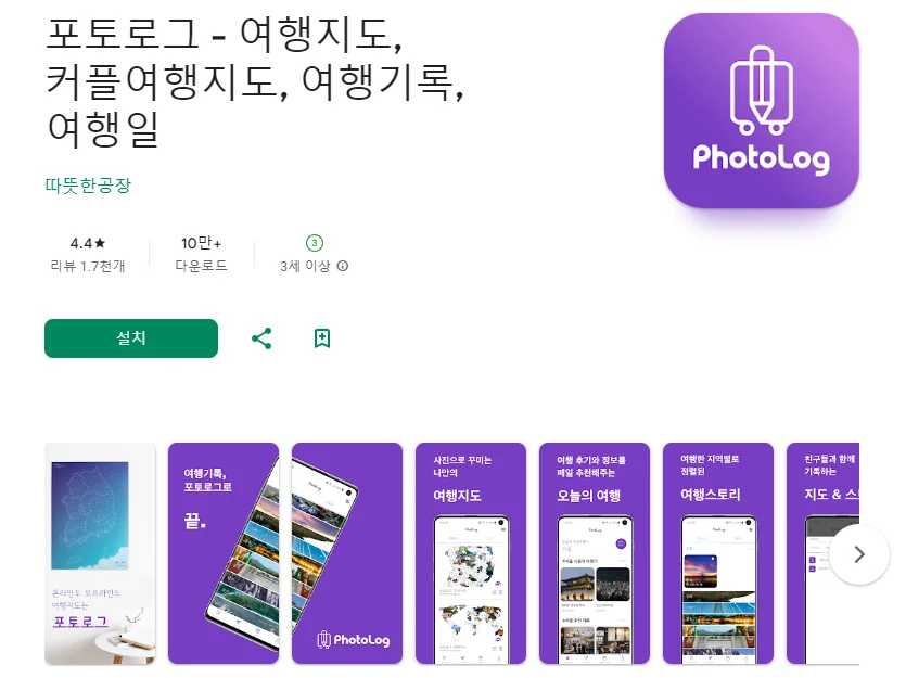 이 어플은 구글플레이스토어에서 "여행 지도"로 검색했을때 3번째로 나오는 어플입니다. 아래는 포토로그 - 여행지도, 커플여행지도, 여행기록, 여행일 어플에 대한 자세한 설명이니 참고하세요.