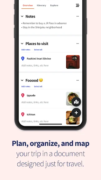한 앱에서 항공 예약, 숙소, 관광지에 접근하세요. 항공권 예약 및 호텔 확인 이메일을 전달하여 계획에 직접 가져오거나 Gmail 연결로 자동 추가하세요. 상세 일정을 원하시나요? '할 일' 및 '주변 맛집' 등의 일반 리스트를 작성할 수 있습니다. 시간이 촉박하고 자세한 일정이 필요하신가요? 시작 (및 종료) 시간을 추가하여 일정을 조직하세요. 일정과 예약 추적에 완벽합니다.