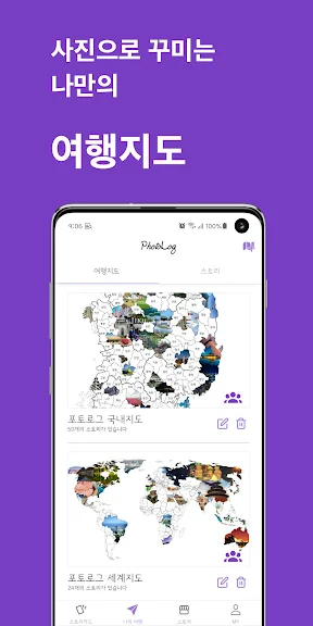 지도에 색을 칠하거나 사진을 채워서 기록을 남기는 여행지도를 아시나요? 색을 칠할 수 있는 앱들은 많지만, 사진을 채울 수 있는 앱은 포토로그 밖에 없습니다