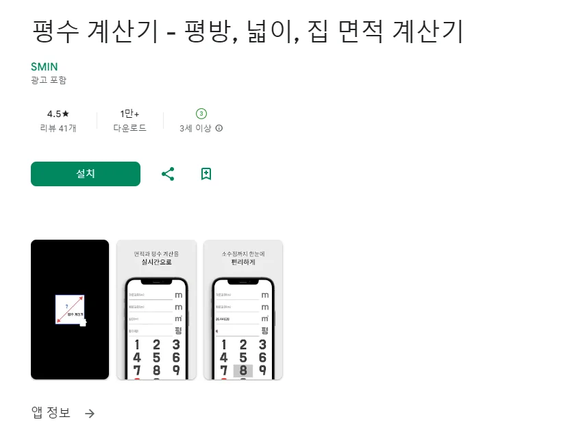 이 어플은 구글플레이스토어에서 "평수 계산기"로 검색했을때 4번째로 나오는 어플입니다. 아래는 평수 계산기 어플에 대한 자세한 설명이니 참고하세요.