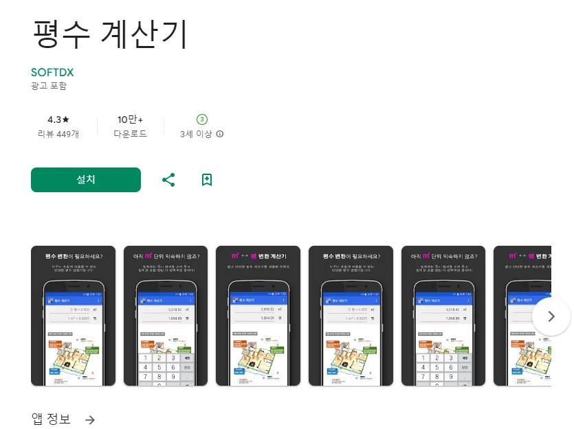 이 어플은 구글플레이스토어에서 "평수 계산기"로 검색했을때 1번째로 나오는 어플입니다. 아래는 평수변환기 (평수계산기) 어플에 대한 자세한 설명이니 참고하세요.