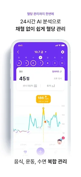 식단 기록 기능은 칼로리와 영양 성분을 자동 계산하고, 건강 점수를 통해 하루 식단의 질을 평가해줍니다. 영양사의 맞춤 피드백으로 식단 관리가 한층 더 쉬워집니다. 또한, 실시간 혈당 측정과 맞춤형 AI 코칭으로 혈당 변동을 관리할 수 있으며, 혈당에 따른 식단과 운동 반응을 세심하게 분석해 건강 개선을 돕습니다.