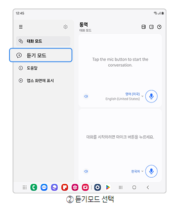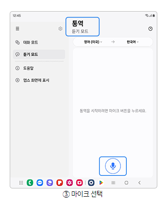 2단계) 듣기모드로 전환되며, 마이크를 선택하면 목소리 내용이 텍스트로 표시되며 실시간 번역됩니다.
