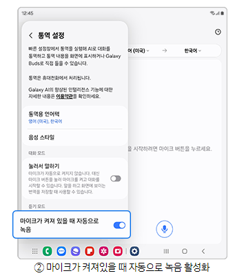 ※ 통역 앱의 설정에서 마이크가 켜져있을 때 자동으로 녹음을 선택하고 활성화 할수 있습니다