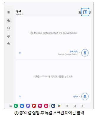 1단계) 통역 앱 실행후 우측 상단 듀얼 스크린 아이콘을 선택합니다.