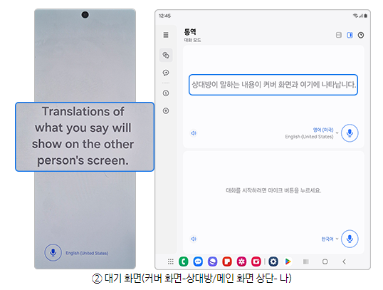 2단계) 듀얼 스크린 모드로 전환되며, 커버화면과 메인화면에 상대방 대화 및 번역 결과가 표시됩니다.