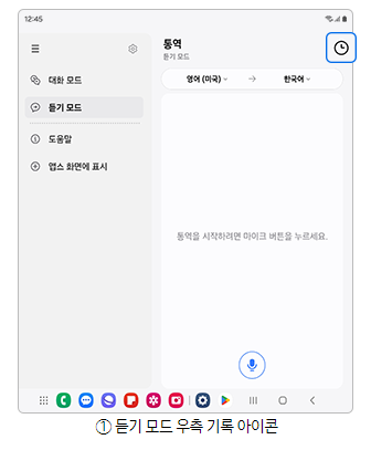 1단계) 통역 앱 듣기 모드에서 우측 기록 아이콘을 선택합니다.