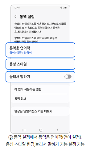2단계) 통역 설정에서 통역용 언어팩(언어 설정), 음성 스타일 변경, 눌러서 말하기 기능을 설정할 수 있습니다.