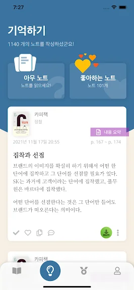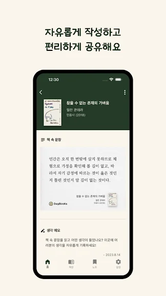 책 속에서 인상 깊은 문장이나 생각을 메모로 남길 수 있어, 독서를 더 깊이 있게 기록할 수 있습니다. 또한, 작성한 내용을 편리하게 다른 사람들과 공유할 수 있어 독서의 즐거움을 함께 나눌 수 있습니다.