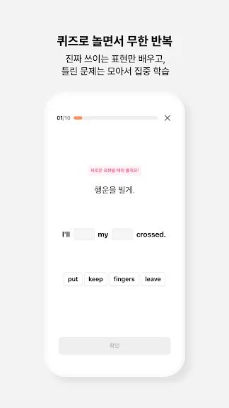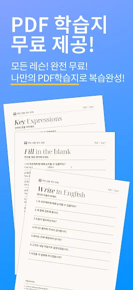 영어 학습은 단계별로 이루어져, 듣기, 청크, 핵심 표현, 단어 학습을 자연스럽게 이어가며 말하기 능력을 키울 수 있습니다. 매일 반복적인 복습을 통해 학습한 표현을 잊지 않게 돕고, 언제 어디서든 반복 학습을 통해 몰입감 있는 학습 환경을 제공합니다.