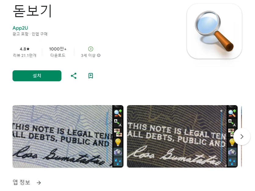 이 어플은 구글플레이스토어에서 "돋보기"로 검색했을때 1번째로 나오는 어플입니다. 아래는 돋보기 어플에 대한 자세한 설명이니 참고하세요.