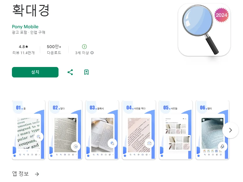 이 어플은 구글플레이스토어에서 "돋보기"로 검색했을때 3번째로 나오는 어플입니다. 아래는 확대경 어플에 대한 자세한 설명이니 참고하세요.