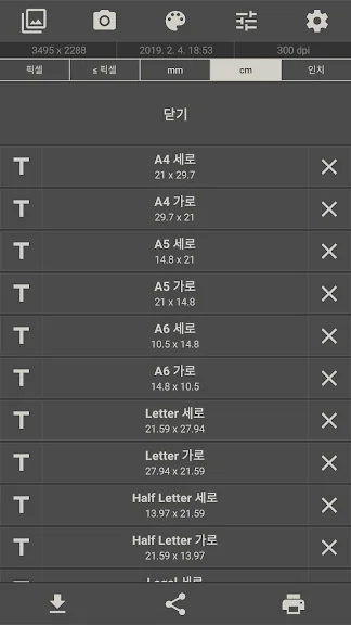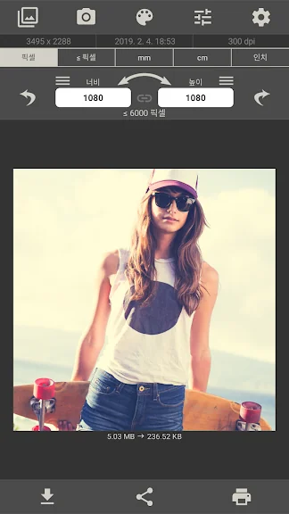 이 앱의 주요 장점은 출력 형식을 지정할 수 있는 4가지 측정 단위(픽셀, 밀리미터, 센티미터, 인치)를 지원한다는 점입니다. 이미지의 크기를 조정한 후에는 저장, 인쇄, 이메일 전송 또는 공유가 가능하여 다양한 용도로 활용할 수 있습니다.