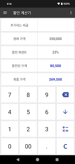사용 방법은 매우 직관적입니다. 원하는 계산 항목을 선택한 후 값을 입력하면 즉시 결과를 확인할 수 있습니다. 백분율 증가 및 감소, 할인 금액, 부가가치세 계산 등 다양한 기능이 포함되어 있으며, 특정 비율을 적용한 가격도 손쉽게 산출할 수 있습니다.