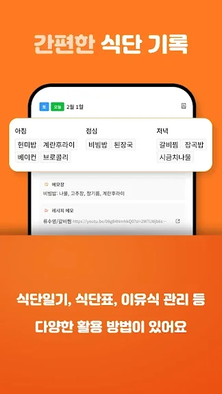 - 식단, 간식/야식, 메모, 레시피 등 다양한 입력 항목