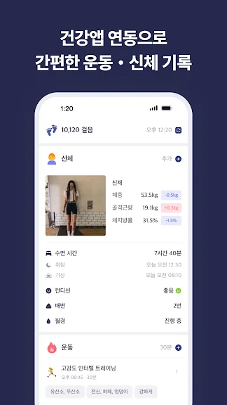 - 건강 앱과의 연동으로 더욱 간단하게 운동, 신체 기록을 남길 수 있어요.