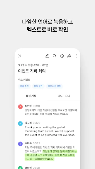한국어, 영어, 일본어, 중국어 대화도 텍스트로 확인하세요.
