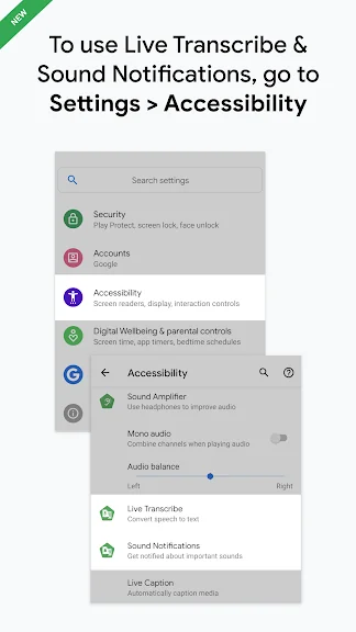 3. 접근성 버튼, 동작 또는 빠른 설정(https://support.google.com/accessibility/android/answer/7650693)을 사용하여 음성 자막 변환 또는 소리 알림을 시작합니다.