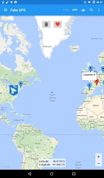 - 큰 "가짜 GPS 시작" 버튼을 눌러 즉시 GPS 위치를 변경할 수 있습니다.