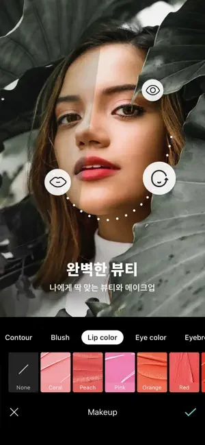 - AR 메이크업 : 데일리부터 트렌디 메이크업까지 자연스러운 룩을 연출하세요, 뷰티와 메이크업은 나에게 어울리도록 조절해 사용할 수 있어요.
