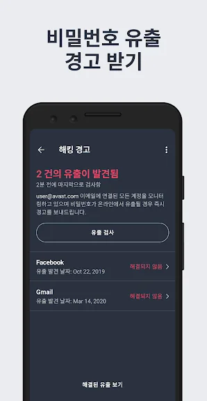 스파이웨어 또는 애드웨어에 감염된 앱이 디바이스에 다운로드되면 백신으로부터 경고를 수신하여 개인 정보를 보호할 수 있습니다. 이메일, 전화 통화, 감염된 웹 사이트 또는 SMS 메시지를 통한 피싱 공격으로부터 디바이스를 보호하세요. VPN을 켜면 해외 여행 중에도 안전하게 온라인 검색을 하는 것은 물론 즐겨찾는 유료 스트리밍 서비스에도 액세스할 수 있습니다. 해커들이 비밀번호를 탈취했을 때는 알림도 보내드립니다. 고급 검사 및 경고 기능으로 사기를 방지합니다.Avast의 신뢰할 수 있는 이메일 감시는 귀하의 이메일 계정에 의심스러운 이메일이 있는지 모니터링합니다.