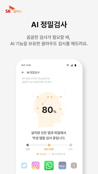 AI기능을 활용한 실시간 바이러스 검사, 신종 범죄에 악용되는 원격제어 앱 탐지, 스미싱검사 등의 전문적인 보안 기능을 제공하고 있습니다.
