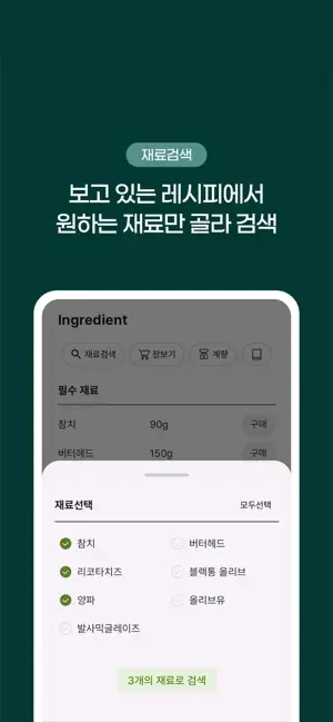 보고있는 레시피에서 원하는 재료만 골라 새로운 요리를 찾을 수 있어요.