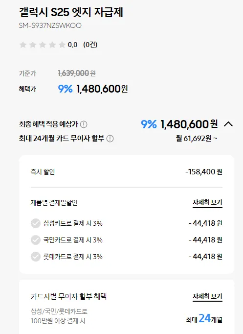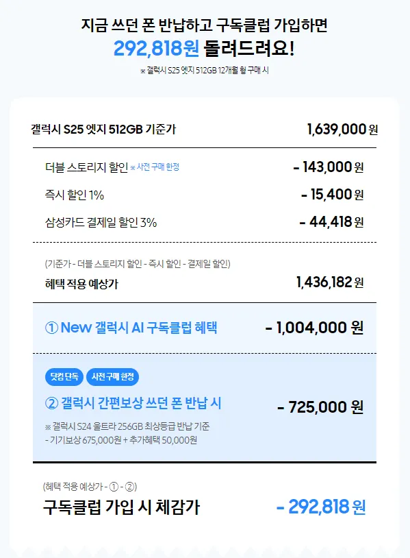 | 모델 | 갤럭시 S25 엣지 자급제/통신사폰 (256GB / 512GB) |
