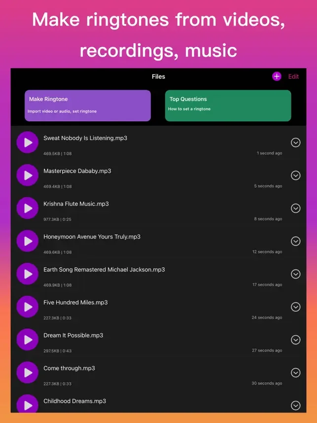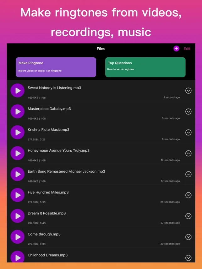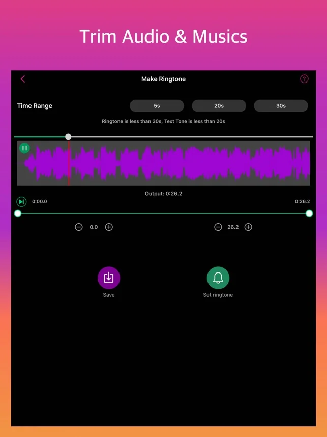무료 벨소리 제작 앱은 출시합니다.컴퓨터와 연결할 팔요없이 해당 앱을 통해 iPhone에서 벨 소리를 직접 제작이 가능합니다. 당신이 즐겨찾는 노래를 벨 소리로 설정하세요!
