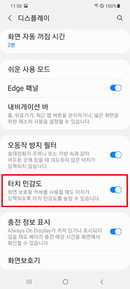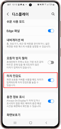 화면 보호기를 부착했을 때 사용 할 수 있는 화면의 터치 민감도를 높이는 기능이 있습니다.