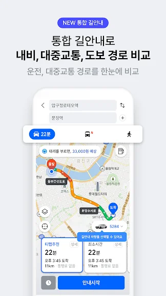 누구나 무료로 다운받아 사용할수 있으며, 실시간 교통정보를 반영하여 빠르고 정확한 길을 안내해드려요