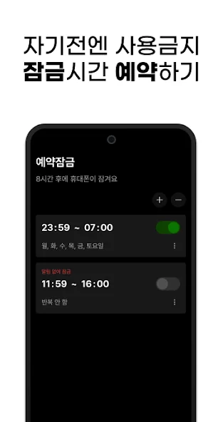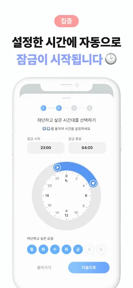 자기 전, 기상 직후 등 특정 시간대에 차단할 앱을 설정하면, 해당 시간대 동안 앱이 자동으로 차단됩니다.