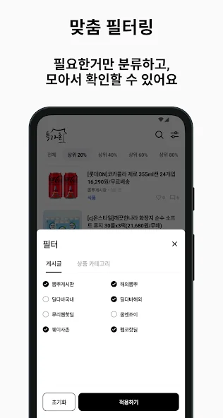 # 약 50개의 관심 카테고리 설정이 가능하며 특가사이트 필터링(뽐뿌, 딜바다, 루리웹, 쿨엔조이, 퀘이사존, 에프엠코리아(펨코) 의 할인 게시판들을 일괄 지원)이 가능합니다.