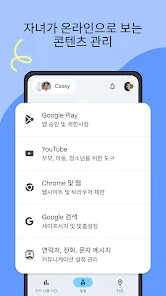• 온라인에서 자녀가 보는 콘텐츠 관리: Chrome, Google Play, YouTube, Google 검색과 같은 Google 서비스에서 자녀 보호 기능을 설정합니다. Family Link를 사용하면 부적절한 사이트를 차단하고, 새 앱에 대한 승인을 요청하도록 설정하며, 앱 및 웹사이트에 대한 권한 등을 관리할 수 있습니다.
