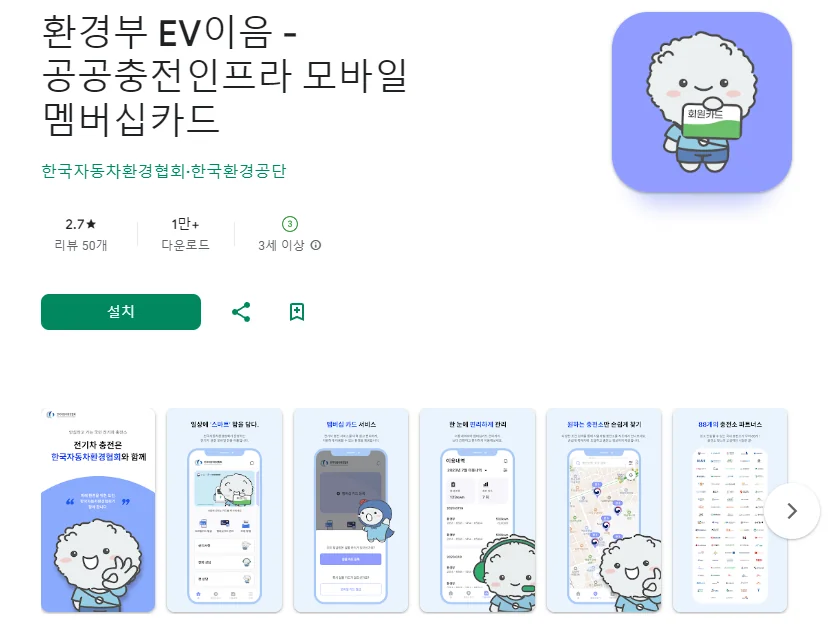 이 어플은 구글플레이스토어에서 "전기차 충전소"로 검색했을때 3번째로 나오는 어플입니다. 아래는 환경부 EV이음 - 공공충전인프라 모바일 멤버십카드 어플에 대한 자세한 설명이니 참고하세요.