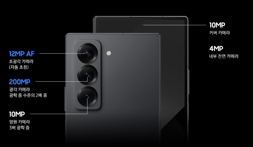 갤럭시 Z 폴드 스페셜 에디션은 Z 시리즈 최초로 2억 화소의 광각 카메라를 탑재했습니다. 이는 스마트폰 카메라로서는 굉장히 혁신적인 스펙으로, 더 선명하고 디테일한 사진을 촬영할 수 있도록 도와줍니다. 특히 어두운 환경에서도 뛰어난 성능을 발휘해, 저조도에서도 선명하고 생동감 넘치는 이미지를 얻을 수 있습니다. 후면에는 12MP 초광각 카메라, 10MP 망원 카메라와 함께 강력한 줌 기능을 제공하며, 다양한 환경에서 최고의 사진을 촬영할 수 있는 유연성을 제공합니다. 또한, ProVisual Engine과 NPU(Neural Processing Unit)의 업그레이드를 통해 사진 편집 기능이 더욱 강화되었습니다. 포토 어시스트 기능을 통해 쉽게 피사체를 인식하고, 손쉬운 사진 편집과 각도 조절, 배경 채우기 등이 가능해졌습니다.